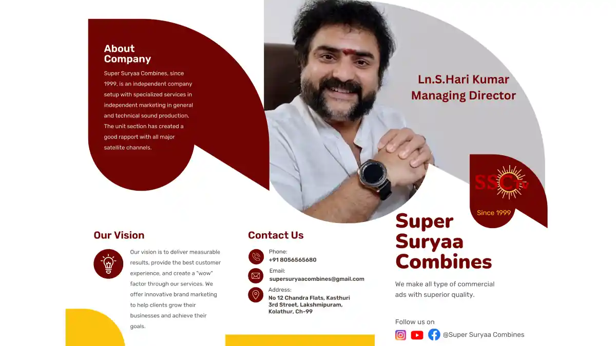 Established in 1999, SSC TV (Super Suryaa Combines) is a leading multimedia and AD film production company based in Chennai. With decades of creative expertise, we transform ideas into powerful visual stories through advertising films, commercial videos, model shoots, CG works, and digital media promotions.
